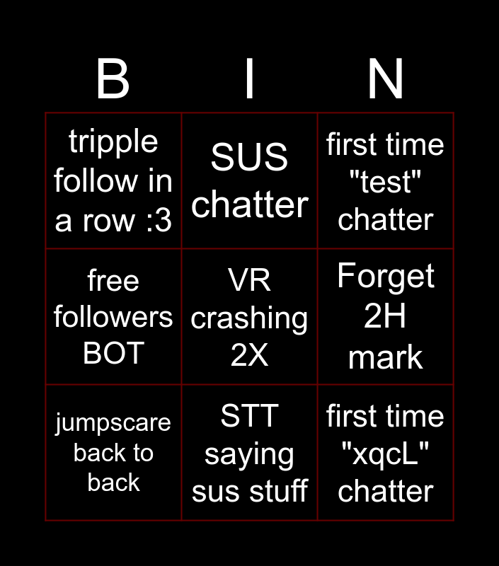 This bingo card has a free space and 8 words: Forget 2H mark, first time "test" chatter, SUS chatter, jumpscare back to back, tripple follow in a row :3, first time "xqcL" chatter, free followers BOT and STT saying sus stuff.