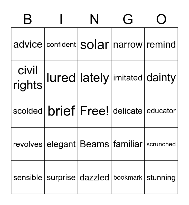 This bingo card has a free space and 26 words: Beams, bookmark, lately, surprise, remind, advice, civil rights, confident, educator, familiar, imitated, scolded, scrunched, sensible, brief, eclipse, narrow, revolves, solar, stunning, dainty, dazzled, delicate, elegant, lured and shimmering.