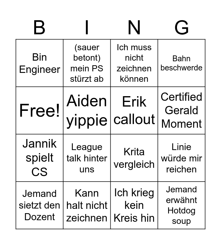 This bingo card has 16 words: Kann halt nicht zeichnen, Linie würde mir reichen, Ich muss nicht zeichnen können, Bin Engineer, Jannik spielt CS, (sauer betont) mein PS stürzt ab, Krita vergleich, Ich krieg kein Kreis hin, Free!, Aiden yippie, Jemand sietzt den Dozent, Bahn beschwerde, League talk hinter uns, Certified Gerald Moment, Erik callout and Jemand erwähnt Hotdog soup.