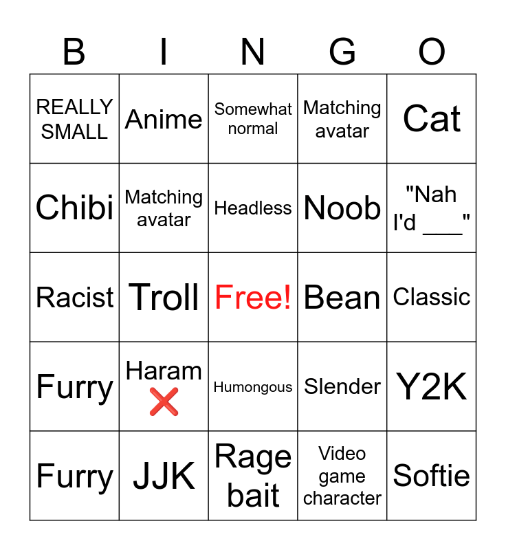 This bingo card has a free space and 24 words: Haram ❌, JJK, Headless, Furry, Cat, REALLY SMALL, Chibi, Anime, Bean, Humongous, Noob, Racist, Slender, Y2K, Matching avatar, Video game character, Classic, Somewhat normal, "Nah I'd ___", Troll, Softie, Furry, Matching avatar and Rage bait.