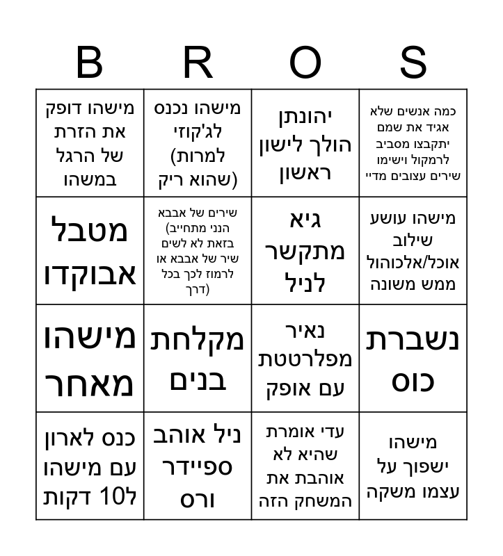 This bingo card has 67 words: תמונה קבוצתית, מישהו מוריד את התחפושת שלו, תיקח שלושה שוטים עם שלושה אנשים שונים, הכוח עולה לאופק לראש, עושים ריקוד עם כריאוגרפיה מוגדרת (לדוגמה: WMCA, Hot To Go etc...), שיחה רצינית מדי על D&D, מישהו נכנס לג'קוזי (למרות שהוא ריק), ראנט על סרטי האלווין/כריסמס, מישהו עושע שילוב אוכל/אלכוהול ממש משונה, עדי אומרת "ווה", עדי מכינה גוואקמולי, עדי תשכב על הרצפה כשהיא תתעייף מלרקוד, עדי אומרת שהיא לא אוהבת את המשחק הזה, מטבל אבוקדו, אזעקה, שירים של אבבא (הנני מתחייב בזאת לא לשים שיר של אבבא או לרמוז לכך בכל דרך), נשברת כוס, מישהו דופק את הזרת של הרגל במשהו, ארבע חולצות מכופתרות סך הכל, מישהו מאחר, מישהו ידבר על המפגש האחרון של הדיאנדי, מישהו ישפוך על עצמו משקה, כמה אנשים שלא אגיד את שמם יתקבצו מסביב לרמקול וישימו שירים עצובים מדיי, חיבוק קבוצתי, רוקדים ביחד hot to go, רפרנס לעלהקיר, מדברים על זה שנאיר סכיזופרנית, חיש גד, מקלחת בנים, צ׳ינצ׳י וגילי מדברים כמו זקנים, כנס לארון עם מישהו ל10 דקות, מישהו בטעות יעשה ריסט לפלייליסט במקום להוסיף לקיו, מישהו ינשנש מהאוכל במטבח בזמן ההכנה(זהירות מסוכן), המילטון, יושבים בג׳קוזי הריק, נאיר ב-love hate relationship עם חתול, נאיר עושה רפרנס לאלינור כוכבת רשת, נאיר הולכת לישון ראשונה, נאיר מפלרטטת עם אופק, נאיר תנסה לשכנע אנשים לבוא לרקוד, נאיר בוכה, גיא מתקשר לניל, ניל אוהב ספיידר ורס, ניל לא אוהב פרוזן 2, ניל עושה משחק מילים., ניל צועק על אנשים במטבח שמפריעים לו, ניל יביא גיטרה וינגן בה, ניל יהיה הראשון שיתפאנגירל שוב מהמפגש האחרון בדי אנד די, ניל יהיה הראשון שיוסיף שירים לקיו כשהפלייליסט ייגמר, ניל שם סינר, יהונתן הולך לישון ראשון, יהונתן מנגן שיר שהוא כתב, יהונתן ינגן בגיטרה של ניל, יהונתן יטפס על משהו, יהונתן יעצור הכל ויעשה נאום על משהו רנדומלי, יהונתן יהיה לבד על הגג באיזשהו שלב של הערב, יהונתן יהיה היחיד שלא ירקוד את הריקוד של hot to go, יהונתן עושה נאום, גילי לא אכל היום כלום, גילי לובש מעיל ארוך כלשהו, גילי ינסה לקפוץ לג׳קוזי, גילי יעשה בדיחה על הגובה של צ'ינצי, גילי שם שירי דיסני, צ׳ינצ׳י ואופק רבים על כלום, צ׳ינצ׳י לא אכלה היום כלום, צ'ינצ'י מרביצה(דוש דוש דוש) למישהו and צ׳ינצ׳י will drunk cry.
