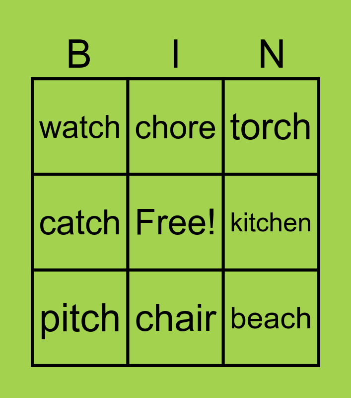 This bingo card has a free space and 10 words: chair, torch, watch, beach, catch, pitch, chore, witch, kitchen and chicken.