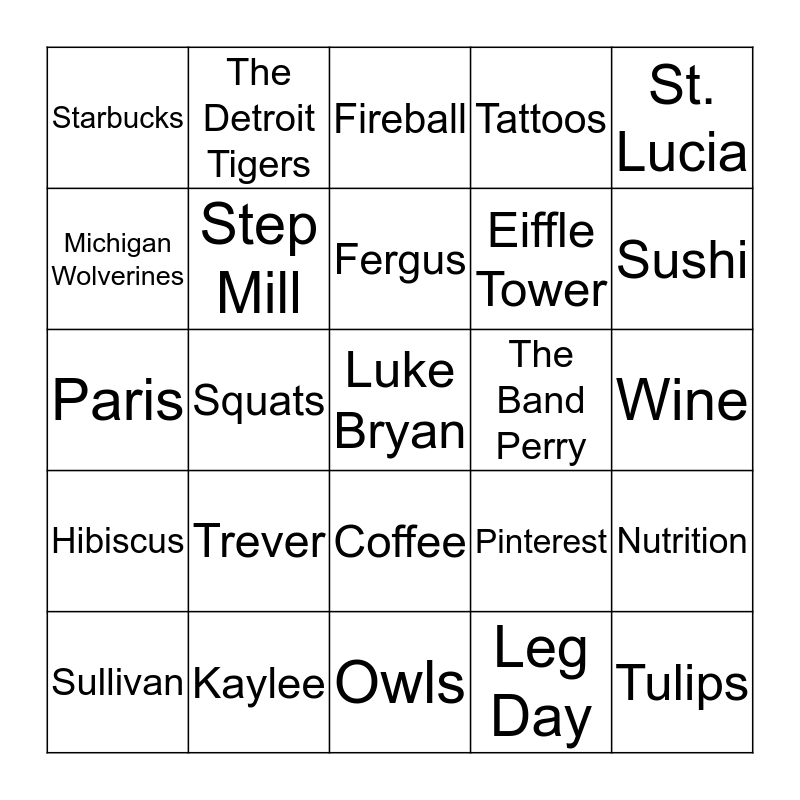 This bingo card has a free space and 24 words: Trever, Kaylee, Fergus, Sullivan, St. Lucia, Starbucks, Michigan Wolverines, The Detroit Tigers, The Band Perry, Coffee, Eiffle Tower, Paris, Pinterest, Nutrition, Step Mill, Leg Day, Wine, Fireball, Sushi, Squats, Tulips, Hibiscus, Tattoos and Owls.