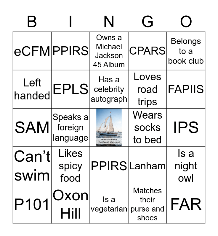This bingo card has a free space and 24 words: Likes spicy food, Oxon Hill, Has a celebrity autograph, P101, Belongs to a book club, eCFM, Left handed, PPIRS, Wears socks to bed, PPIRS, Loves road trips, SAM, Lanham, Is a night owl, EPLS, Matches their purse and shoes, IPS, Owns a Michael Jackson 45 Album, FAPIIS, Speaks a foreign language, FAR, Can’t swim, CPARS and Is a vegetarian.