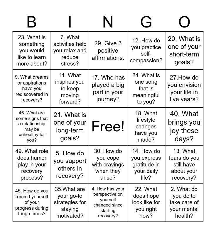 This bingo card has a free space and 50 words: 1. What motivated you to seek recovery?, 2. What do you do to take care of your mental health?, 3. What has been your biggest challenge so far?, 4. How has your perspective on yourself changed since starting recovery?, 5. How do you support others in recovery?, 6. Can you share a time when you felt particularly supported by someone?, 7. What activities help you relax and reduce stress?, 8. How do you handle negative emotions or setbacks?, 9. What dreams or aspirations have you rediscovered in recovery?, 10. What lessons have you learned about yourself in recovery?, 11. What inspires you to keep moving forward?, 12. How do you practice self-compassion?, 13. What fears do you still have about your recovery?, 14. How do you express gratitude in your daily life?, 15. What is something you're good at?, 16. What is something you never want to forget?, 17. Who has played a big part in your journey?, 18. What lifestyle changes have you made?, 19. How do you practice self-care?, 20. What is one of your short-term goals?, 21. What is one of your long-term goals?, 22. What does hope look like for you right now?, 23. What is something you would like to learn more about?, 24. What is one song that is meaningful to you?, 25. What would you like to say to your past self?, 26. How do you handle feelings of guilt or shame from your past?, 27.How do you envision your life in five years?, 28. What are 3 of your coping skills?, 29. Give 3 positive affirmations., 30. How do you cope with cravings when they arise?, 31. What is something you value?, 32. What is one fun fact about yourself?, 33. What is something that makes you laugh?, 34. How does empathy play a part in your recovery?, 35.What are your go-to strategies for staying motivated?, 36. Can you share a pivotal moment in your recovery journey?, 37. What are you looking forward to?, 38. What is something you've lost that you would like to get back?, 39.How do you handle feelings of guilt or shame from your past?, 40. What brings you joy these days?, 41.Who has been a source of inspiration for you in recovery?, 42. What is one thing you appreciate about your recovery journey?, 43. How do you practice forgiveness—toward yourself and others?, 44. What aspects of your life do you feel have improved the most?, 45. How do you remind yourself of your progress during tough times?, 46. What are some signs that a relationship may be unhealthy for you?, 47. What does it mean to you to be part of a recovery community?, 48. How do you establish healthy boundaries with others?, 49. What role does humor play in your recovery process? and 50. What qualities do you appreciate most about yourself now?.