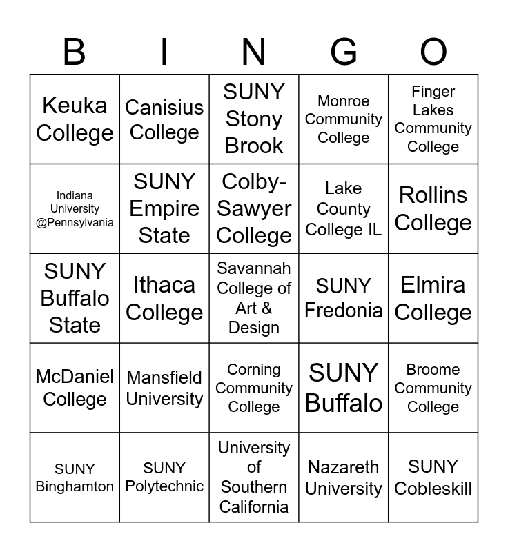 This bingo card has 67 words: Free!, Alfred University, American University, Broome Community College, Bucknell, California University of PA, Canisius College, Clarkson University, Colby-Sawyer College, Cornell, Corning Community College, Delaware Valley University, Elmira College, Finger Lakes Community College, Grand Canyon University, Indiana University @Pennsylvania, Ithaca College, Keuka College, Kutztown University, Lake County College IL, Mansfield University, McDaniel College, Monroe Community College, Nazareth University, Niagara University, NYU, Quinnipiac University, Regent University, Rollins College, Russell Sage College, Savannah College of Art & Design, St. Bonaventure, St. John Fisher, SUNY Albany, SUNY Alfred State, SUNY Binghamton, SUNY Brockport, SUNY Buffalo, SUNY Buffalo State, SUNY Cobleskill, Suny Cortland, SUNY Empire State, SUNY Fredonia, SUNY Geneseo, SUNY Morrisville, SUNY Oneonta, SUNY Oswego, SUNY Polytechnic, SUNY Potsdam, SUNY Purchase, SUNY Stony Brook, SUNY St. Lawerence University, Syracuse University, TC3, The Pennsylvania State University, University of Southern California, Universidad de Cordoba, Universidad de Cuernavaca, Universidad de la Rochelle, Universidad de Rio Cuarto, University of North London, University of Phoenix, University of Rochester, University of Tubingen (Germany), Valencia UCF, Walden University and West Chester University.