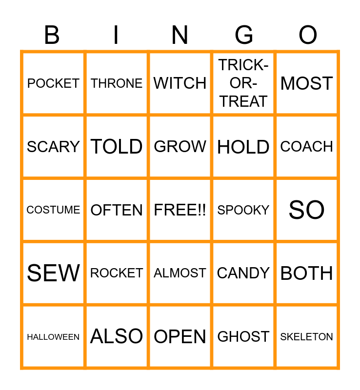 This bingo card has a free space and 24 words: ROCKET, ALSO, GROW, HALLOWEEN, MOST, POCKET, SCARY, THRONE, SPOOKY, ALMOST, HOLD, COSTUME, CANDY, BOTH, TOLD, GHOST, SO, WITCH, COACH, OFTEN, SKELETON, SEW, TRICK-OR-TREAT and OPEN.
