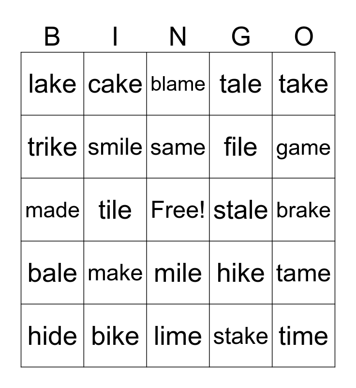 This bingo card has a free space and 24 words: make, bike, same, hide, take, lake, trike, cake, stale, mile, file, made, hike, tame, smile, stake, brake, blame, game, tile, time, bale, tale and lime.