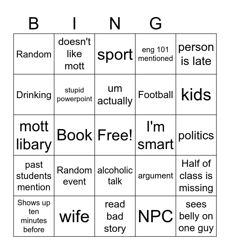 This bingo card has a free space and 24 words: Random event, wife, um actually, Shows up ten minutes before, person is late, Random, Drinking, doesn't like mott, I'm smart, alcoholic talk, Football, mott libary, argument, Half of class is missing, stupid powerpoint, NPC, politics, sport, kids, Book, sees belly on one guy, past students mention, eng 101 mentioned and read bad story.