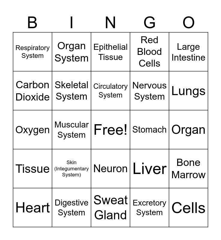 This bingo card has a free space and 24 words: Skin (Integumentary System), Digestive System, Circulatory System, Heart, Large Intestine, Respiratory System, Carbon Dioxide, Organ System, Stomach, Neuron, Nervous System, Oxygen, Liver, Bone Marrow, Skeletal System, Excretory System, Organ, Epithelial Tissue, Lungs, Muscular System, Cells, Tissue, Red Blood Cells and Sweat Gland.