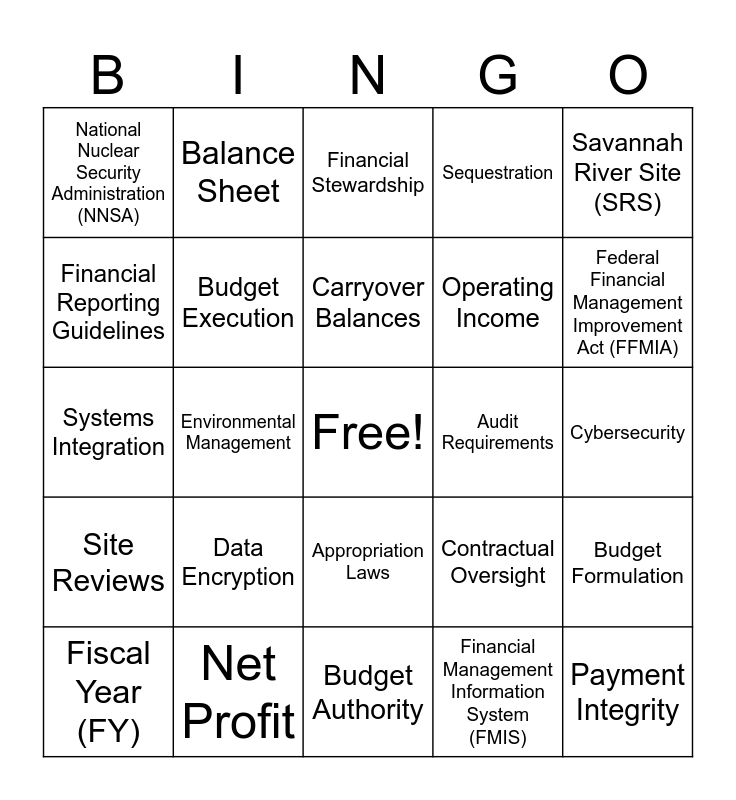 This bingo card has a free space and 97 words: Site Budget, Laboratory Funding, Field Audits, Environmental Management, Site Operations, National Laboratories, Field Office Reporting, Energy Efficiency Projects, Clean Energy Demonstrations, Reimbursable Work, Field Audit Reports, Federal Energy Regulatory Commission (FERC), Field Project Financing, Site Reviews, Power Marketing Administrations, National Nuclear Security Administration (NNSA), Savannah River Site (SRS), Oak Ridge National Laboratory (ORNL), Laboratory Directed Research and Development (LDRD), Field Office Structure, Appropriations, Allotments, Congressional Budget Justification, Continuing Resolution, Supplemental Funding, Carryover Balances, Fiscal Year (FY), Budget Formulation, Working Capital Fund, Apportionments, Budget Execution, Sequestration, Obligations and Outlays, Deficit Reduction, Budget Authority, Appropriation Laws, Budget Reprogramming, Operating Budget, Budgetary Resources, Systems Integration, Enterprise Resource Planning (ERP), Cybersecurity, Data Analytics, Financial Management Information System (FMIS), Data Encryption, Cloud Computing, Cybersecurity Audits, Blockchain for Finance, Network Security, Digital Transformation, IT Modernization, Cloud Storage, Data Warehousing, ERP Software, System Implementation, IT Budgeting, Disaster Recovery Planning, Balance Sheet, Income Statement, Statement of Cash Flows, Liabilities, Assets, Revenue Recognition, Expenses, Equity, Depreciation, Amortization, Retained Earnings, Gross Profit, Net Profit, Operating Income, Accounts Receivable, Accounts Payable, Capital Expenditures, Financial Reporting, Cash Basis Accounting, Accrual Basis Accounting, Internal Controls, Audit Requirements, Cost Accounting Standards (CAS), Government Accountability Office (GAO) Policies, Federal Financial Management Improvement Act (FFMIA), Office of Management and Budget (OMB) Circulars, Compliance Audits, Financial Regulations, Risk Management, Payment Integrity, Fiscal Accountability, Fraud Prevention, Improper Payments, Financial Stewardship, Transparency in Government Finance, Financial Policy Memorandum, Contractual Oversight, Financial Reporting Guidelines, Cost Allocations and Grants Management.