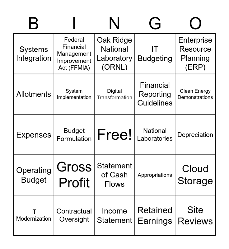 This bingo card has a free space and 97 words: Supplemental Funding, Carryover Balances, Fiscal Year (FY), Budget Formulation, Working Capital Fund, Apportionments, Budget Execution, Sequestration, Obligations and Outlays, Deficit Reduction, Budget Authority, Appropriation Laws, Budget Reprogramming, Operating Budget, Budgetary Resources, Systems Integration, Enterprise Resource Planning (ERP), Cybersecurity, Data Analytics, Financial Management Information System (FMIS), Data Encryption, Cloud Computing, Cybersecurity Audits, Blockchain for Finance, Network Security, Digital Transformation, IT Modernization, Cloud Storage, Data Warehousing, ERP Software, System Implementation, IT Budgeting, Disaster Recovery Planning, Balance Sheet, Income Statement, Statement of Cash Flows, Liabilities, Assets, Revenue Recognition, Expenses, Equity, Depreciation, Amortization, Retained Earnings, Gross Profit, Net Profit, Operating Income, Accounts Receivable, Accounts Payable, Capital Expenditures, Financial Reporting, Cash Basis Accounting, Accrual Basis Accounting, Internal Controls, Audit Requirements, Cost Accounting Standards (CAS), Government Accountability Office (GAO) Policies, Federal Financial Management Improvement Act (FFMIA), Office of Management and Budget (OMB) Circulars, Compliance Audits, Financial Regulations, Risk Management, Payment Integrity, Fiscal Accountability, Fraud Prevention, Improper Payments, Financial Stewardship, Transparency in Government Finance, Financial Policy Memorandum, Contractual Oversight, Financial Reporting Guidelines, Cost Allocations, Grants Management, Site Budget, Laboratory Funding, Field Audits, Environmental Management, Site Operations, National Laboratories, Field Office Reporting, Energy Efficiency Projects, Clean Energy Demonstrations, Reimbursable Work, Field Audit Reports, Federal Energy Regulatory Commission (FERC), Field Project Financing, Site Reviews, Power Marketing Administrations, National Nuclear Security Administration (NNSA), Savannah River Site (SRS), Oak Ridge National Laboratory (ORNL), Laboratory Directed Research and Development (LDRD), Field Office Structure, Appropriations, Allotments, Congressional Budget Justification and Continuing Resolution.