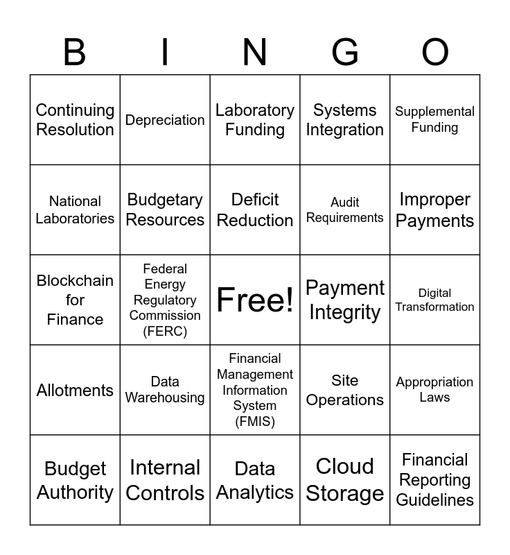 This bingo card has a free space and 97 words: Clean Energy Demonstrations, Reimbursable Work, Field Audit Reports, Federal Energy Regulatory Commission (FERC), Field Project Financing, Site Reviews, Power Marketing Administrations, National Nuclear Security Administration (NNSA), Savannah River Site (SRS), Oak Ridge National Laboratory (ORNL), Laboratory Directed Research and Development (LDRD), Field Office Structure, Appropriations, Allotments, Congressional Budget Justification, Continuing Resolution, Supplemental Funding, Carryover Balances, Fiscal Year (FY), Budget Formulation, Working Capital Fund, Apportionments, Budget Execution, Sequestration, Obligations and Outlays, Deficit Reduction, Budget Authority, Appropriation Laws, Budget Reprogramming, Operating Budget, Budgetary Resources, Systems Integration, Enterprise Resource Planning (ERP), Cybersecurity, Data Analytics, Financial Management Information System (FMIS), Data Encryption, Cloud Computing, Cybersecurity Audits, Blockchain for Finance, Network Security, Digital Transformation, IT Modernization, Cloud Storage, Data Warehousing, ERP Software, System Implementation, IT Budgeting, Disaster Recovery Planning, Balance Sheet, Income Statement, Statement of Cash Flows, Liabilities, Assets, Revenue Recognition, Expenses, Equity, Depreciation, Amortization, Retained Earnings, Gross Profit, Net Profit, Operating Income, Accounts Receivable, Accounts Payable, Capital Expenditures, Financial Reporting, Cash Basis Accounting, Accrual Basis Accounting, Internal Controls, Audit Requirements, Cost Accounting Standards (CAS), Government Accountability Office (GAO) Policies, Federal Financial Management Improvement Act (FFMIA), Office of Management and Budget (OMB) Circulars, Compliance Audits, Financial Regulations, Risk Management, Payment Integrity, Fiscal Accountability, Fraud Prevention, Improper Payments, Financial Stewardship, Transparency in Government Finance, Financial Policy Memorandum, Contractual Oversight, Financial Reporting Guidelines, Cost Allocations, Grants Management, Site Budget, Laboratory Funding, Field Audits, Environmental Management, Site Operations, National Laboratories, Field Office Reporting and Energy Efficiency Projects.