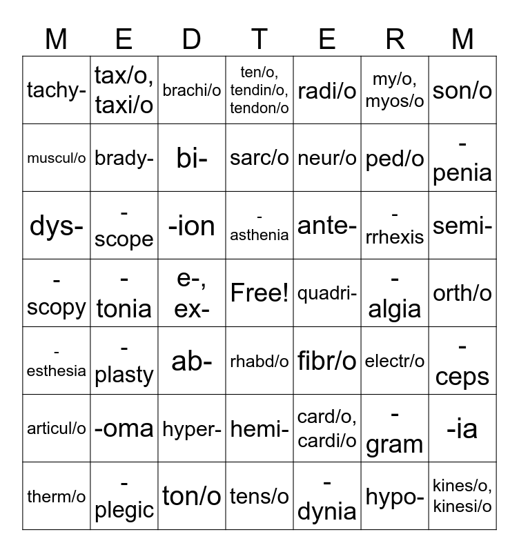 This bingo card has a free space and 77 words: ambul/o, articul/o, brachi/o, card/o, cardi/o, dextr/o, duct/o, electr/o, fasci/o, fibr/o, flex/o, kines/o, kinesi/o, lei/o, muscul/o, my/o, myos/o, myocardi/o, neur/o, orth/o, ped/o, plant/o, radi/o, rhabd/o, sarc/o, son/o, tax/o, taxi/o, ten/o, tendin/o, tendon/o, tens/o, therm/o, ton/o, vers/o, a-, an-, ab-, ad-, ambi-, ante-, bi-, brady-, circum-, dorsi-, dys-, e-, ex-, hemi-, hyper-, hypo-, in-, par-, para-, quadri-, semi-, tachy-, tri-, -ac, -al, -ar, -ic, -algia, -asthenia, -cele, -ceps, -dynia, -ectomy, -esthesia, -gram, -graphy, -ia, -ion, -itis, -logy, -lysis, -malacia, -oma, -paresis, -penia, -plasty, -plegia, -plegic, -rrhexis, -scope, -scopy, -tomy, -tonia and -trophy.