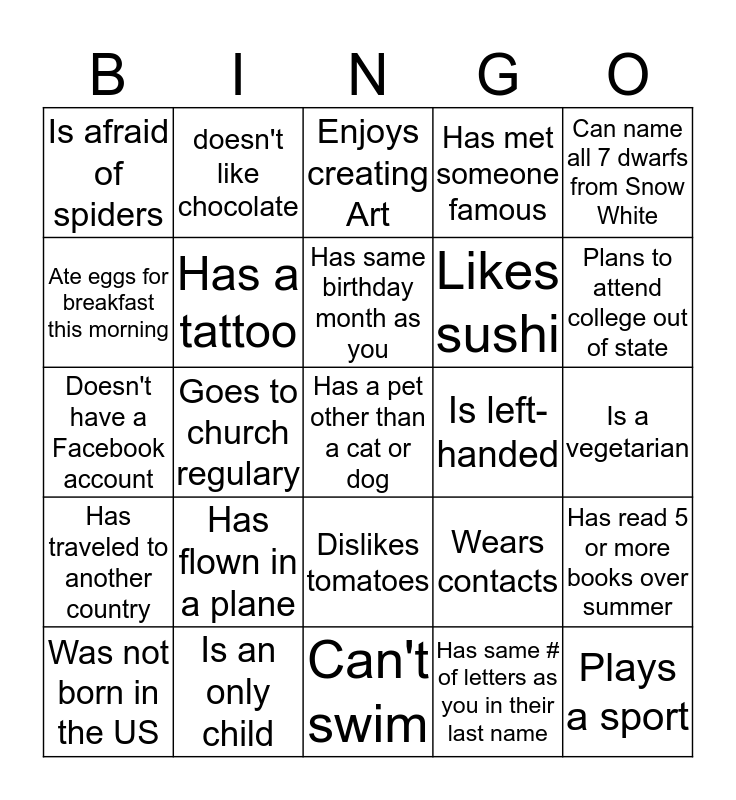 This bingo card has 25 words: Has flown in a plane, Can't swim, Has same birthday month as you, Was not born in the US, Can name all 7 dwarfs from Snow White, Is afraid of spiders, Ate eggs for breakfast this morning, doesn't like chocolate, Is left-handed, Dislikes tomatoes, Likes sushi, Doesn't have a Facebook account, Wears contacts, Has read 5 or more books over summer, Has a tattoo, Plays a sport, Is a vegetarian, Enjoys creating Art, Plans to attend college out of state, Goes to church regulary, Has a pet other than a cat or dog, Is an only child, Has traveled to another country, Has met someone famous and Has same # of letters as you in their last name.
