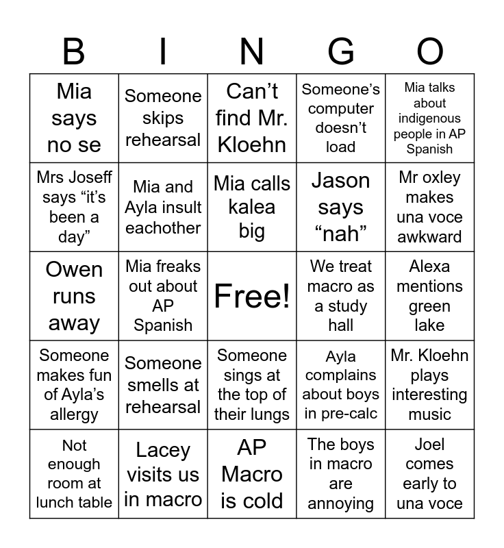 This bingo card has a free space and 24 words: Someone smells at rehearsal, Lacey visits us in macro, Mia calls kalea big, Not enough room at lunch table, Mia talks about indigenous people in AP Spanish, Mia says no se, Mrs Joseff says “it’s been a day”, Someone skips rehearsal, We treat macro as a study hall, Someone sings at the top of their lungs, Jason says “nah”, Owen runs away, Ayla complains about boys in pre-calc, Mr. Kloehn plays interesting music, Mia and Ayla insult eachother, The boys in macro are annoying, Alexa mentions green lake, Can’t find Mr. Kloehn, Mr oxley makes una voce awkward, Mia freaks out about AP Spanish, Joel comes early to una voce, Someone makes fun of Ayla’s allergy, Someone’s computer doesn’t load and AP Macro is cold.