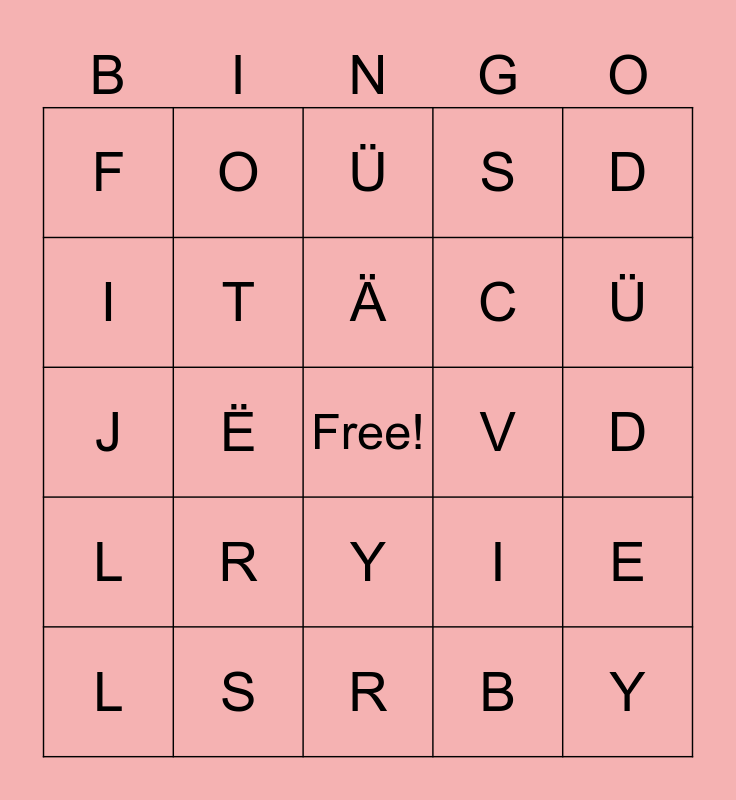 This bingo card has a free space and 55 words: A, L, N, F, R, B, T, W, C, H, S, Ä, K, E, J, G, D, Ë, O, Y, V, Ö, I, Ü, A, Ä, B, C, D, E, Ë, F, G, H, I, J, K, L, M, N, O, Ö, P, Q, R, S, ẞ, T, U, Ü, V, W, X, Y and Z.