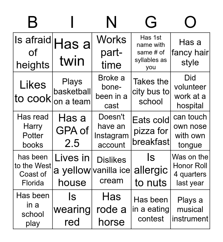 This bingo card has 25 words: Lives in a yellow house, Has rode a horse, Broke a bone- been in a cast, Has been in a school play, Has a fancy hair style, Is afraid of heights, Likes to cook, Has a twin, Eats cold pizza for breakfast, Dislikes vanilla ice cream, Takes the city bus to school, Has read Harry Potter books, Is allergic to nuts, Was on the Honor Roll 4 quarters last year, Plays basketball on a team, Plays a musical instrument, can touch own nose with own tongue, Works part-time, Did volunteer work at a hospital, Has a GPA of 2.5, Doesn't have an Instagram account, Is wearing red, has been to the West Coast of Florida, Has 1st name with same # of syllables as you and Has been in a eating contest.