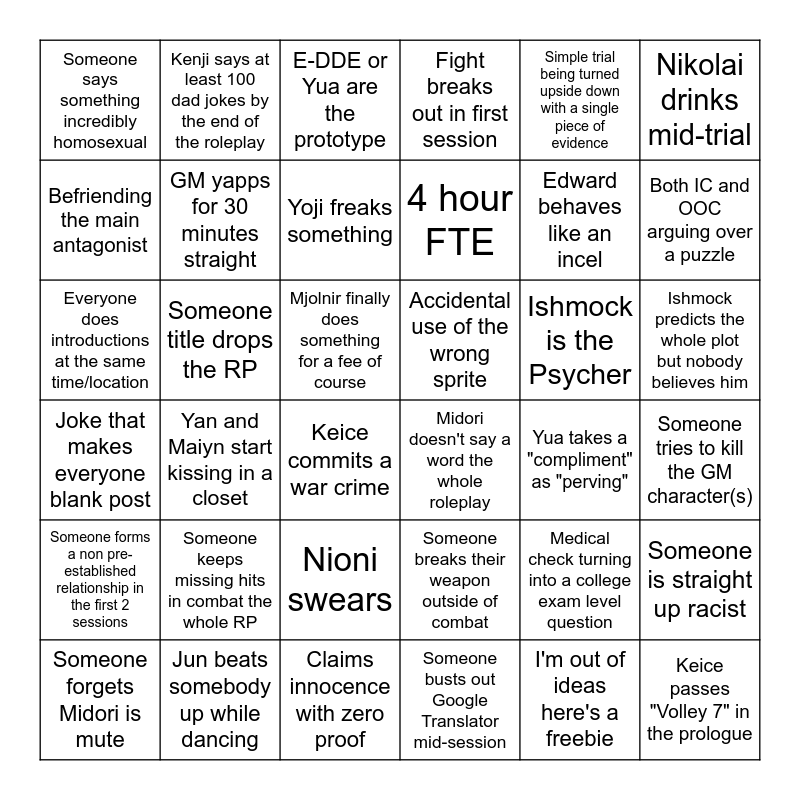 This bingo card has 36 words: Someone breaks their weapon outside of combat, Nioni swears, Someone busts out Google Translator mid-session, Befriending the main antagonist, Joke that makes everyone blank post, Accidental use of the wrong sprite, GM yapps for 30 minutes straight, Claims innocence with zero proof, Simple trial being turned upside down with a single piece of evidence, Medical check turning into a college exam level question, Both IC and OOC arguing over a puzzle, Fight breaks out in first session, Someone is straight up racist, Someone title drops the RP, 4 hour FTE, Someone says something incredibly homosexual, Someone forms a non pre-established relationship in the first 2 sessions, Ishmock is the Psycher, Everyone does introductions at the same time/location, E-DDE or Yua are the prototype, Mjolnir finally does something for a fee of course, Yan and Maiyn start kissing in a closet, Midori doesn't say a word the whole roleplay, Keice commits a war crime, Yua takes a "compliment" as "perving", Kenji says at least 100 dad jokes by the end of the roleplay, Edward behaves like an incel, Jun beats somebody up while dancing, Yoji freaks something, Nikolai drinks mid-trial, Keice passes "Volley 7" in the prologue, Someone forgets Midori is mute, Someone tries to kill the GM character(s), Ishmock predicts the whole plot but nobody believes him, Someone keeps missing hits in combat the whole RP and I'm out of ideas here's a freebie.