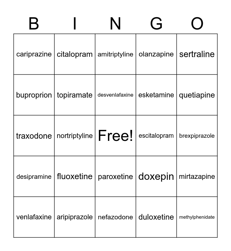 This bingo card has a free space and 24 words: fluoxetine, aripiprazole, desvenlafaxine, venlafaxine, sertraline, cariprazine, buproprion, citalopram, escitalopram, paroxetine, esketamine, traxodone, doxepin, mirtazapine, topiramate, duloxetine, brexpiprazole, amitriptyline, quetiapine, nortriptyline, methylphenidate, desipramine, olanzapine and nefazodone.