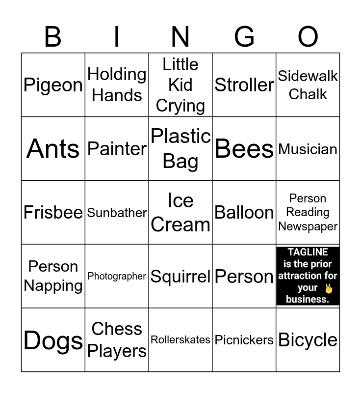 This bingo card has 1 images and 27 words: Flowers, Bees, Picnickers, Ants, Little Kid Crying, Holding Hands, Person Napping, Balloon, Dogs, Frisbee, Stroller, Chess Players, Rollerskates, Musician, Juggler, Photographer, Painter, Plastic Bag, Squirrel, Pigeon, Bicycle, Ice Cream, Sunbather, Person Reading Newspaper, Person, Sidewalk Chalk and Hopscotch.
