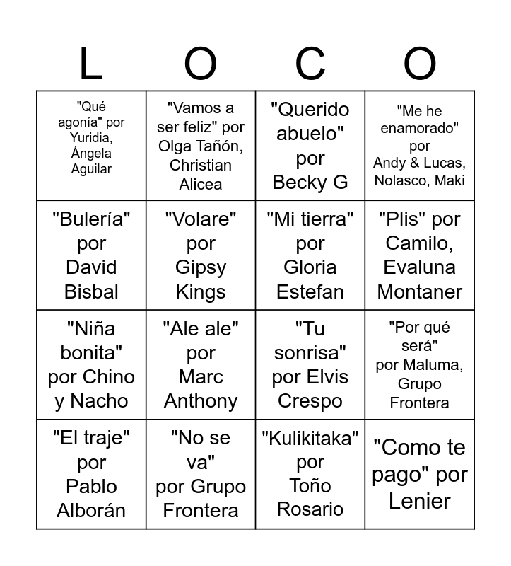 This bingo card has 16 words: "No se va" por Grupo Frontera, "Por qué será" por Maluma, Grupo Frontera, "Querido abuelo" por Becky G, "Qué agonía" por Yuridia, Ángela Aguilar, "Niña bonita" por Chino y Nacho, "Vamos a ser feliz" por Olga Tañón, Christian Alicea, "Tu sonrisa" por Elvis Crespo, "Kulikitaka" por Toño Rosario, "Bulería" por David Bisbal, "Volare" por Gipsy Kings, "El traje" por Pablo Alborán, "Me he enamorado" por Andy & Lucas, Nolasco, Maki, "Ale ale" por Marc Anthony, "Plis" por Camilo, Evaluna Montaner, "Mi tierra" por Gloria Estefan and "Como te pago" por Lenier.