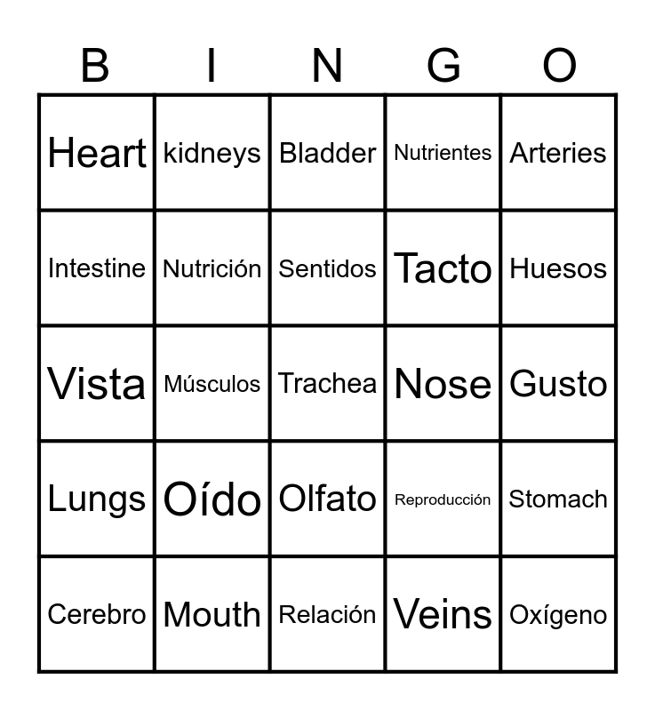 This bingo card has 25 words: Lungs, Mouth, Trachea, Veins, Arteries, Heart, kidneys, Bladder, Nose, Stomach, Intestine, Nutrición, Relación, Reproducción, Huesos, Cerebro, Músculos, Sentidos, Tacto, Gusto, Vista, Oído, Olfato, Nutrientes and Oxígeno.