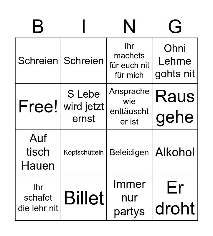 This bingo card has 16 words: Billet, Alkohol, Ihr machets für euch nit für mich, Schreien, Auf tisch Hauen, Schreien, Beleidigen, Immer nur partys, Free!, S Lebe wird jetzt ernst, Ihr schafet die lehr nit, Ohni Lehrne gohts nit, Kopfschütteln, Raus gehe, Ansprache wie enttäuscht er ist and Er droht.