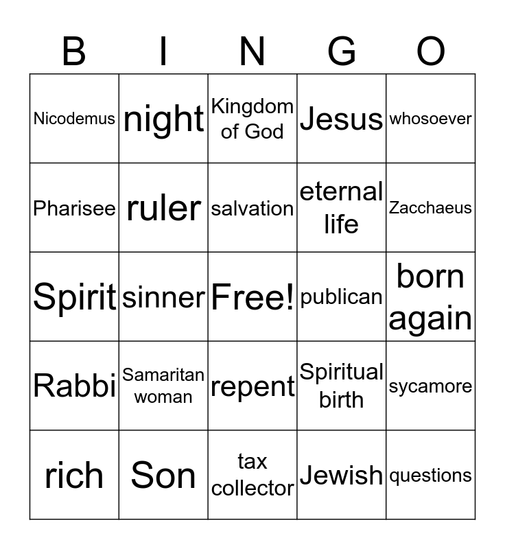 This bingo card has a free space and 26 words: repent, Jewish, salvation, Son, whosoever, Nicodemus, Pharisee, night, born again, Spiritual birth, eternal life, Spirit, sycamore, rich, sinner, teacher, Jesus, Rabbi, Kingdom of God, questions, Zacchaeus, tax collector, publican, Samaritan woman, ruler and short.