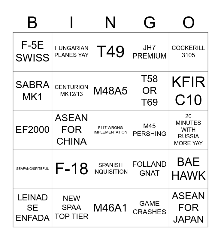 This bingo card has a free space and 24 words: F-18, NEW SPAA TOP TIER, M48A5, LEINAD SE ENFADA, COCKERILL 3105, F-5E SWISS, SABRA MK1, HUNGARIAN PLANES YAY, M45 PERSHING, SPANISH INQUISITION, T58 OR T69, EF2000, FOLLAND GNAT, BAE HAWK, CENTURION MK12/13, GAME CRASHES, 20 MINUTES WITH RUSSIA MORE YAY, T49, KFIR C10, ASEAN FOR CHINA, ASEAN FOR JAPAN, SEAFANG/SPITEFUL, JH7 PREMIUM and M46A1.