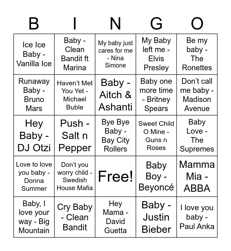 This bingo card has 26 words: Free!, Baby - Justin Bieber, Baby - Aitch & Ashanti, Cry Baby - Clean Bandit, Be my baby - The Ronettes, Ice Ice Baby - Vanilla Ice, Runaway Baby - Bruno Mars, Baby - Clean Bandit ft Marina, Baby Love - The Supremes, Baby Boy - Beyoncé, Baby one more time - Britney Spears, Hey Baby - DJ Otzi, Mamma Mia - ABBA, Baby, I love your way - Big Mountain, Push - Salt n Pepper, Baby got back - Sir Mix a Lot, My Baby left me - Elvis Presley, Love to love you baby - Donna Summer, My baby just cares for me - Nina Simone, Bye Bye Baby - Bay City Rollers, Don’t call me baby - Madison Avenue, Hey Mama - David Guetta, Sweet Child O Mine - Guns n Roses, Don’t you worry child - Swedish House Mafia, Haven’t Met You Yet - Michael Buble and I love you baby - Paul Anka.