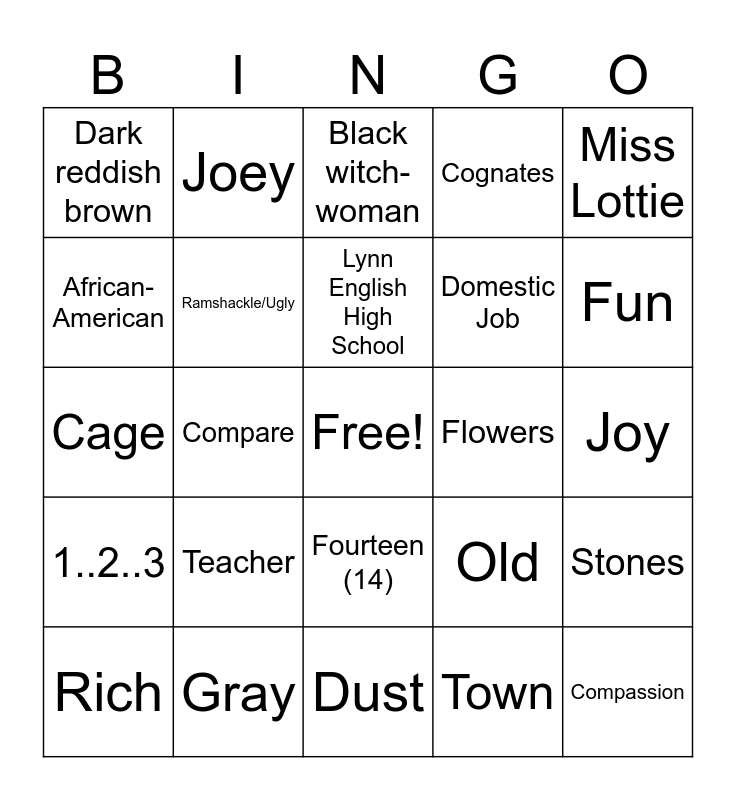 This bingo card has a free space and 24 words: Teacher, Gray, Lynn English High School, Rich, Miss Lottie, Dark reddish brown, African- American, Joey, Flowers, Fourteen (14), Domestic Job, Cage, Old, Stones, Ramshackle/Ugly, Town, Joy, Black witch-woman, Fun, Compare, Compassion, 1..2..3, Cognates and Dust.