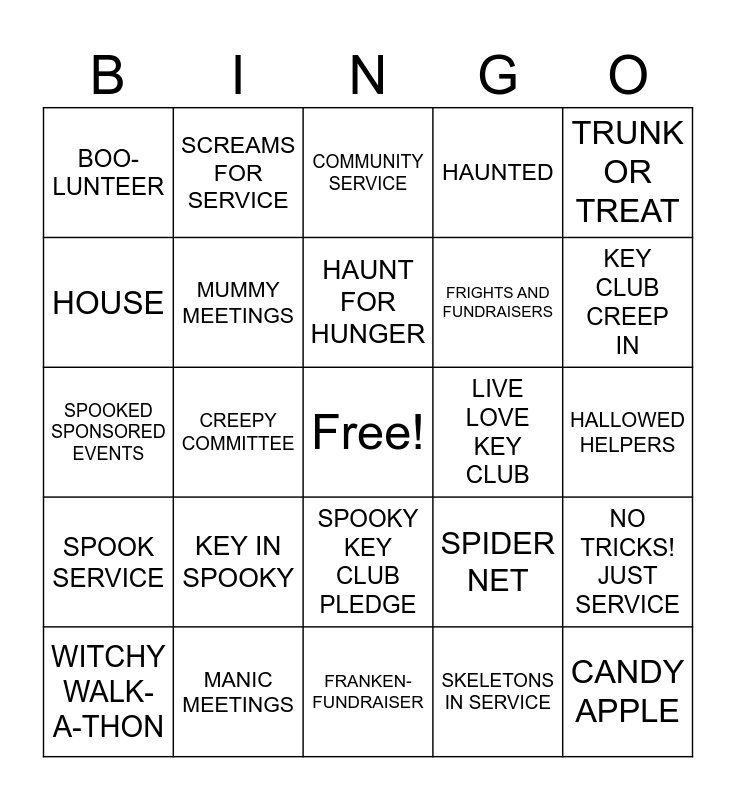 This bingo card has a free space and 35 words: FREE KEY CLUB SPACE, GHOSTLY DONATIONS, CANDY CORN, MUMMY MEETINGS, SPOOKY KEY CLUB PLEDGE, HAUNTED, HOUSE, JACK-O-LANTERN, HAUNT FOR HUNGER, FANGTASTIC FUNDRAISER, SPOOKED SPONSORED EVENTS, TRUNK OR TREAT, SCARECROW, SKELETON, BOO-LUNTEER, LIVE LOVE KEY CLUB, SKELETONS IN SERVICE, CREEPY COMMITTEE, SPOOK SERVICE, CANDY APPLE, SPIDER NET, WITCHY WALK-A-THON, NO TRICKS! JUST SERVICE, MANIC MEETINGS, COMMUNITY SERVICE, KEY CLUB CREEP IN, TRICK OR TREAT FOR CHANGE, VOLUNTEER HOURS, FRIGHTS AND FUNDRAISERS, HALLOWED HELPERS, VAMPIRES OF VOLUNTEER, FRANKEN-FUNDRAISER, KEY IN SPOOKY, SCREAMS FOR SERVICE and HALLOWEEN HELPERS.