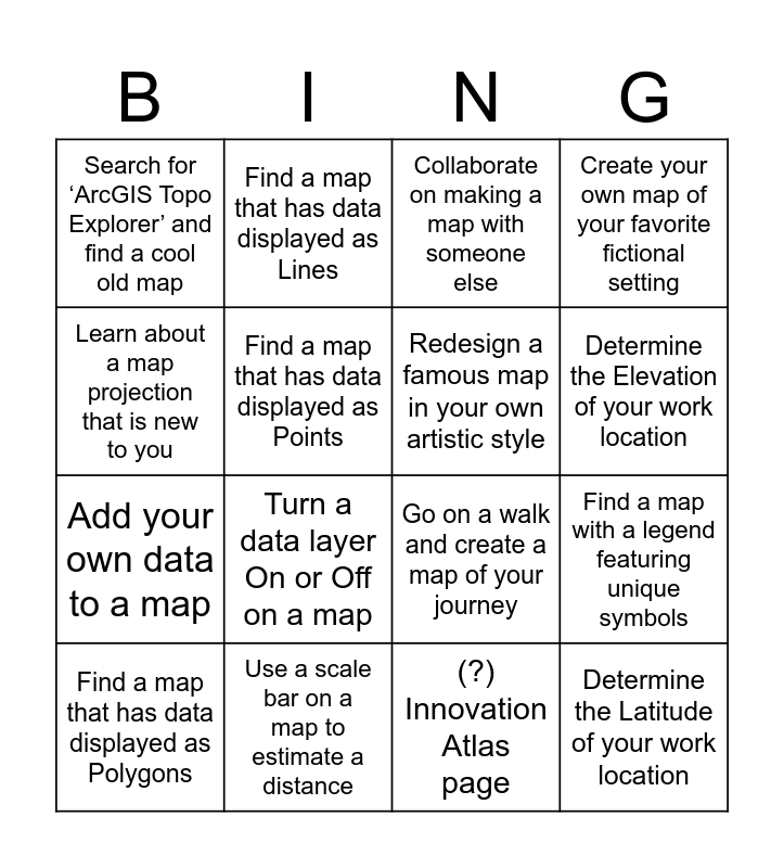 This bingo card has 23 words: Determine the Latitude of your work location, Determine the Longitude of your work location, Determine the Elevation of your work location, Find historical imagery of an interesting location, Learn about a map projection that is new to you, Search for ‘ArcGIS Topo Explorer’ and find a cool old map, Find a map that has data displayed as Points, Find a map that has data displayed as Lines, Find a map that has data displayed as Polygons, Find a map that does NOT display North as up, Turn a data layer On or Off on a map, Add your own data to a map, Explore your state’s hub/portal site for open GIS data, Use a map to explore a location you have never visited, Use a scale bar on a map to estimate a distance, Find something on a historical map that no longer exists, Collaborate on making a map with someone else, Go on a walk and create a map of your journey, Redesign a famous map in your own artistic style, Find a map with a legend featuring unique symbols, Create your own map of your favorite fictional setting, (?) Innovation Atlas page and (?) GIS request form.