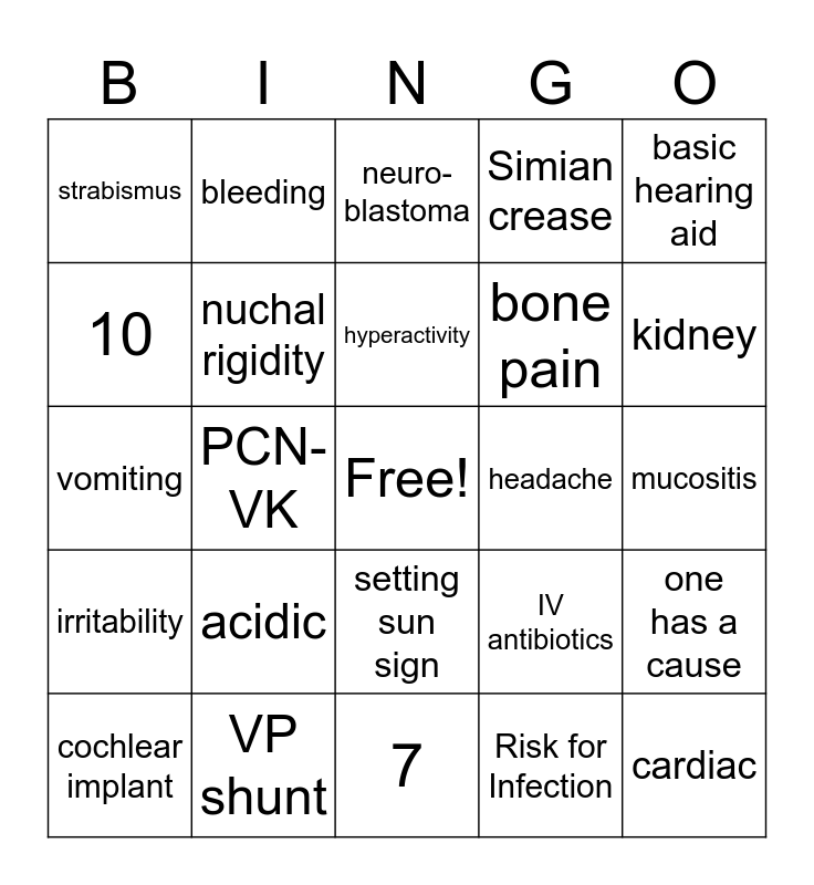 This bingo card has a free space and 24 words: acidic, VP shunt, hyperactivity, cochlear implant, basic hearing aid, strabismus, 10, bleeding, headache, setting sun sign, bone pain, vomiting, IV antibiotics, one has a cause, nuchal rigidity, Risk for Infection, mucositis, neuro- blastoma, kidney, PCN-VK, cardiac, irritability, Simian crease and 7.