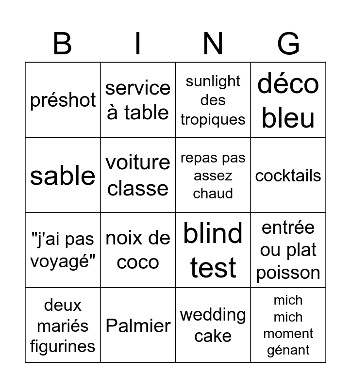 This bingo card has 16 words: Palmier, entrée ou plat poisson, sunlight des tropiques, préshot, "j'ai pas voyagé", service à table, blind test, wedding cake, sable, voiture classe, deux mariés figurines, déco bleu, noix de coco, cocktails, repas pas assez chaud and mich mich moment génant.