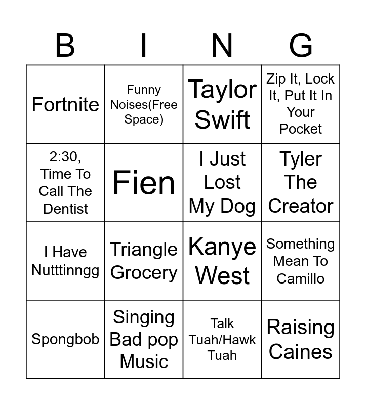 This bingo card has 19 words: Kanye West, Skibidi Toilet, Taylor Swift, Raising Caines, Something Mean To Camillo, 2:30, Time To Call The Dentist, Talk Tuah/Hawk Tuah, Fortnite, Funny Noises(Free Space), I Have Nutttinngg, Triangle Grocery, Fien, I Just Lost My Dog, Singing Bad pop Music, Spongbob, FIVE MINUTES REMAINING!!!, Zip It, Lock It, Put It In Your Pocket, Tyler The Creator and Diddy.