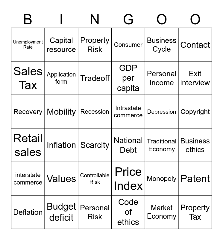 This bingo card has 71 words: Free!, Capital resource, Opportunity Cost, Market Economy, Traditional Economy, Capitalist Economy, Consumer, Demand, Tradeoff, Human Resources, Scarcity, Gross Domestic Product, GDP per capita, Unemployment Rate, Productivity, Personal Income, Retail sales, Business Cycle, Prosperity, Recession, Depression, Recovery, Inflation, Price Index, Deflation, Capital Project, Stock, Bond, Budget deficit, Budget Surplus, National Debt, Social responsibility, Non-renewable resources, Ethics, Business ethics, Code of ethics, Pollution, Conflict of interest, Contact, Patent, Copyright, interstate commerce, Intrastate commerce, Logo, Public utility, Monopoly, Antitrust laws, Sales Tax, Income Tax, Property Tax, Career, Informational interview, Mobility, Values, Talent, Ability, Application form, Resume, Career portfolio, Cover letter, Employment Interview, Mentir, Exit interview, Risk, Economic risk, Personal Risk, Property Risk, Liability Risk, Pure RIsk, Controllable Risk and Insurance.