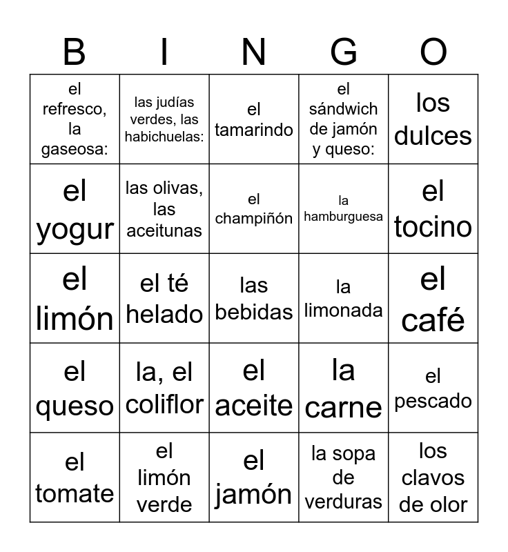 This bingo card has 91 words: Free!, cúrcuma, el aceite, el achiote, el agua, el aguacate, el almuerzo, el apio, el arroz, el azúcar, El banano, el plátano, el guineo:, el bistec, el brócoli, el café, el cereal, el champiñón, el chorizo, el cilantro, el comino molido, el desayuno, el helado, el hielo, el jamón, el jugo, el limón, el limón verde, el maíz, el pan, el panqueque, la panqueca, el pavo, el perro caliente (la salchicha):, el pescado, el pollo, el queso, el refresco, la gaseosa:, el sándwich de jamón y queso:, el tamarindo, el té, el té helado, el tocino, el tomate, el yogur, la avena, La canela, la canela en rama, la carne, la cebolla, la cena, la comida, la ensalada, la ensalada de frutas, la galleta, la hamburguesa, la harina de maíz, la leche, la leche evaporada, la lechuga, la limonada, la mantequilla, la mantequilla de maní:, la manzana, la mayonesa, la mostaza, la naranja, la pimienta, la piña, la pizza, la salsa de tomate, la sopa de verduras, la torta, la zanahoria, la, el coliflor, las bebidas, las fresas, las frutas, las judías verdes, las habichuelas:, las olivas, las aceitunas, las patatas, las papas, las uvas, las verduras, Leche condensada azucarada, los clavos de olor, los dulces, los espaguetis, los fideos, la pasta, los guisantes, las arvejas, los huevos, los lácteos, los pasteles, los patacones, los tostones, Las moras and El queso crema.