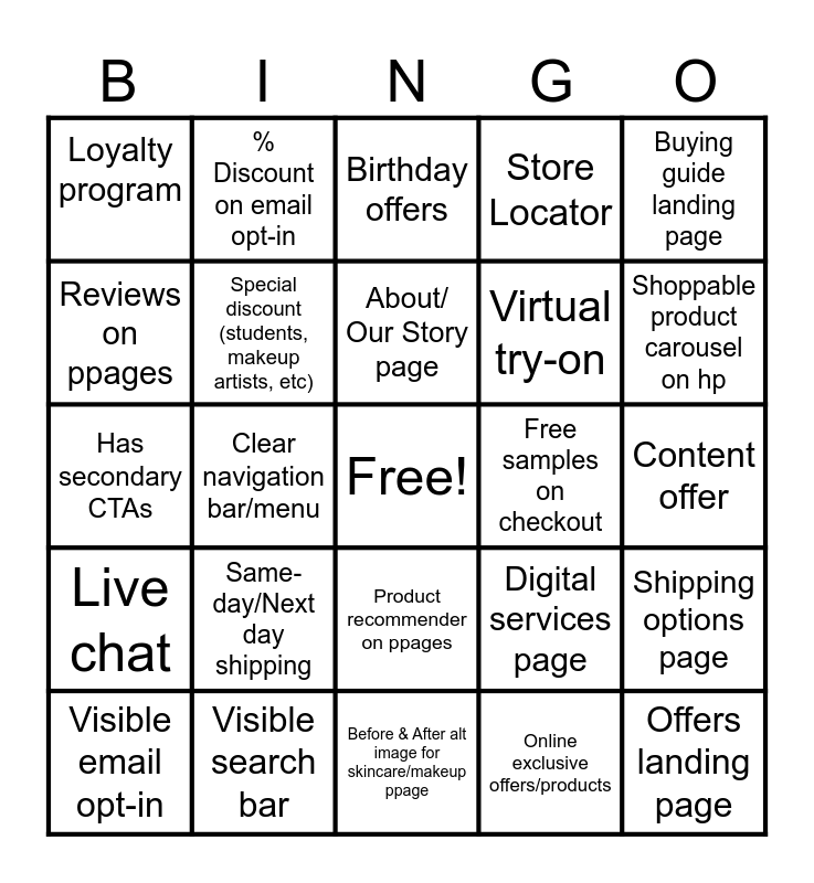 This bingo card has a free space and 29 words: Visible email opt-in, Breadcrumb trails, Clear navigation bar/menu, Instalment payment option, Loyalty program, Birthday offers, Special discount (students, makeup artists, etc), Same-day/Next day shipping, Free samples on checkout, Visible search bar, Content offer, Offers landing page, Before & After alt image for skincare/makeup ppage, Online exclusive offers/products, Shoppable product carousel on hp, Videos on ppages, Product recommender on ppages, Live chat, Buying guide landing page, Has secondary CTAs, Digital services page, FAQs page, Virtual try-on, Reviews on ppages, Store Locator, % Discount on email opt-in, Shipping options page, About/ Our Story page and Last Chance/ Discontinued products page.