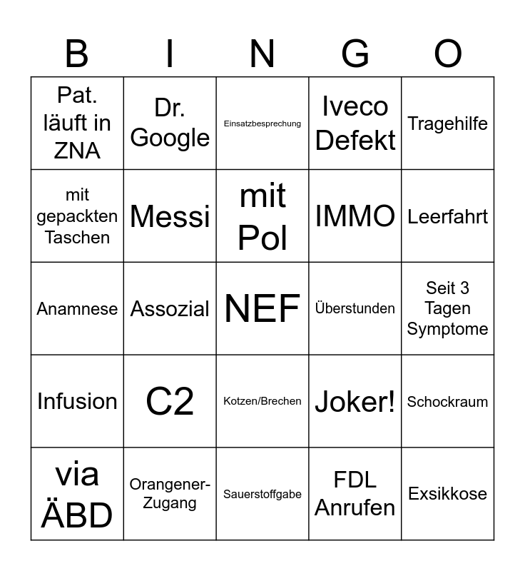 This bingo card has 25 words: C2, Sauerstoffgabe, mit Pol, via ÄBD, Tragehilfe, Pat. läuft in ZNA, mit gepackten Taschen, Dr. Google, Überstunden, Kotzen/Brechen, IMMO, Anamnese, Joker!, Schockraum, Messi, Exsikkose, Seit 3 Tagen Symptome, Einsatzbesprechung, Leerfahrt, Assozial, NEF, Orangener-Zugang, Infusion, Iveco Defekt and FDL Anrufen.