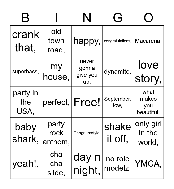 This bingo card has a free space and 31 words: day n night,, Footloose,, perfect,, sweet caroline,, crank that,, happy,, my house,, shake it off,, September, low,, no role modelz,, what makes you beautiful,, YMCA,, cotton eye joe,, watch me whip,, love story,, Starships,, only girl in the world,, party rock anthem,, baby shark,, Gangnumstyle,, Macarena,, time after time,, yeah!,, old town road,, dynamite,, superbass,, congratulations,, party in the USA,, cha cha slide,, never gonna give you up, and thinking out loud.