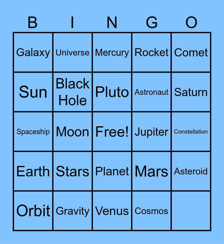 This bingo card has a free space and 24 words: Earth, Gravity, Planet, Mars, Comet, Galaxy, Universe, Mercury, Astronaut, Asteroid, Sun, Black Hole, Milky Way, Jupiter, Saturn, Orbit, Moon, Pluto, Rocket, Constellation, Spaceship, Stars, Venus and Cosmos.