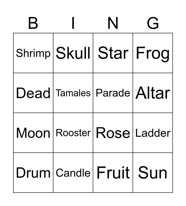 This bingo card has 22 words: Candle, Marigold, Skull, Mariachi, Tamales, Parade, Shrimp, Star, Rose, Sun, Moon, Frog, Cactus, Salt, Fruit, Crown, Ladder, Drum, Rooster, Dead, Altar and Spider.