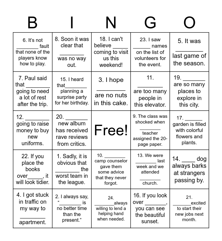 This bingo card has a free space and 24 words: 1. Sadly, it is obvious that ________ the worst team in the league., 2. I always say, “________ is no better time than the present.”, 3. I hope ________ are no nuts in this cake., 4. I got stuck in traffic on my way to ________ apartment., 5. It was ________ last game of the season., 6. It’s not ________ fault that none of the players know how to play., 7. Paul said that ________ going to need a lot of rest after the trip., 8. Soon it was clear that ________ was no way out., 9. The class was shocked when ________ teacher assigned the 20-page paper., 10. ________ camp counselor gave them some advice that they never forgot., 11. ________ are too many people in this elevator., 12. ________ going to raise money to buy new uniforms., 13. We were ________ last week and we attended ________ church., 14. ____ dog always barks at strangers passing by., 15. I heard that________ planning a surprise party for her birthday., 16. If you look over _______, you can see the beautiful sunset., 17. ______ garden is filled with colorful flowers and plants., 18. I can't believe _____ coming to visit us this weekend!, 19. _______ are so many places to explore in this city., 20. _______ new album has received rave reviews from critics., 21. _______excited to start their new jobs next month., 22. If you place the books over_____, it will look tidier., 23. I saw ______ names on the list of volunteers for the event. and 24. ________always willing to lend a helping hand when needed..