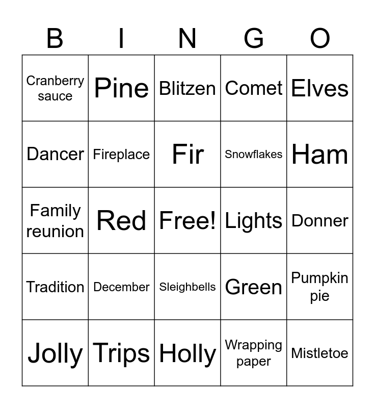 This bingo card has a free space and 80 words: Bells, Bethlehem, Blitzen, Candy, Candy canes, Cards, Cedar, Celebrate, Chimney, Cookies, Christmas tree, Cold, Comet, Cranberry sauce, Cupid, Dancer, Dasher, December, Decorations, Donner, Eggnog, Elves, Family reunion, Fir, Fireplace, Frosty, Fruitcake, Gift boxes, Gifts, Greetings, Ham, Holiday, Holly, Icicles, Jolly, Lights, Lists, Merry, Miracle, Mistletoe, New Year, Noel, North Pole, Party, Pie, Pine, Plum pudding, Poinsettia, Prancer, Presents, Pumpkin pie, Red, Green, Reindeer, Ribbon, Rudolph, Scrooge, Season, Sled, Sleighbells, Snowflakes, Spirit, St. Nick, Star, Stocking stuffers, Sweet potato, Tidings, Tinsel, Togetherness, Toys, Tradition, Trips, Turkey, Vacation, Vixen, Winter, Wrapping paper, Wreath, Yule and Yuletide.