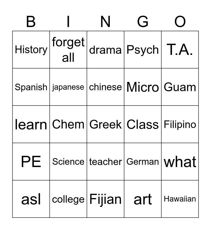 This bingo card has a free space and 39 words: math, russian, who, japanese, asl, teacher, chinese, financial Lit, T.A., PE, Chem, Psych, Hawaiian, Filipino, Class, Science, English, History, French, German, Spanish, Fijian, Micro, Guam, how-much, subject, hard, remember most, remember litte bit, forget all, easy, hard, drama, college, art, music, what, learn and language BG.