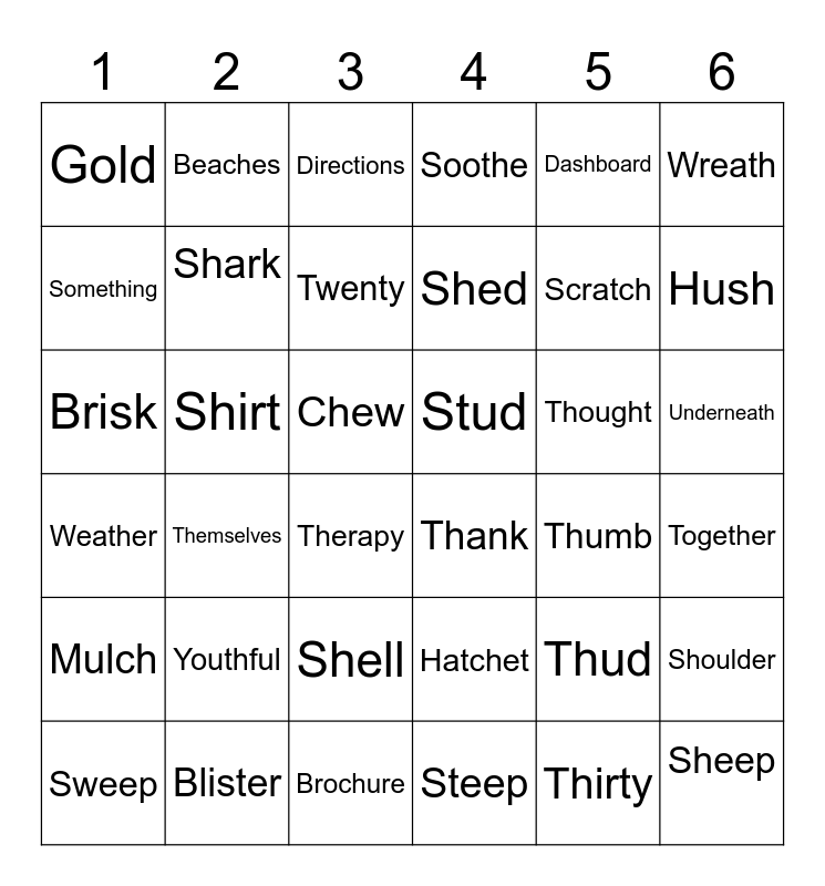 This bingo card has 36 words: Hatchet, Shell, Steep, Something, Weather, Stud, Shark, Brochure, Dashboard, Thud, Hush, Soothe, Shoulder, Shirt, Shed, Gold, Mulch, Thought, Brisk, Directions, Chew, Themselves, Thank, Therapy, Thumb, Beaches, Scratch, Blister, Twenty, Wreath, Sheep, Sweep, Together, Underneath, Youthful and Thirty.