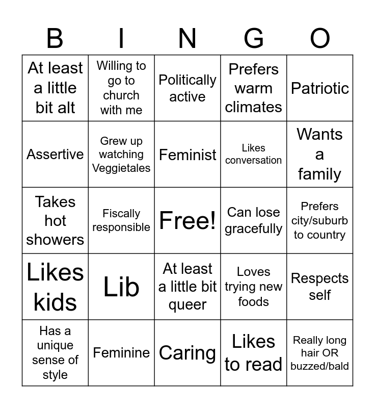 This bingo card has a free space and 24 words: Lib, Feminine, Feminist, Has a unique sense of style, Patriotic, At least a little bit alt, Assertive, Willing to go to church with me, Can lose gracefully, At least a little bit queer, Likes conversation, Takes hot showers, Loves trying new foods, Respects self, Grew up watching Veggietales, Likes to read, Prefers city/suburb to country, Politically active, Wants a family, Fiscally responsible, Really long hair OR buzzed/bald, Likes kids, Prefers warm climates and Caring.