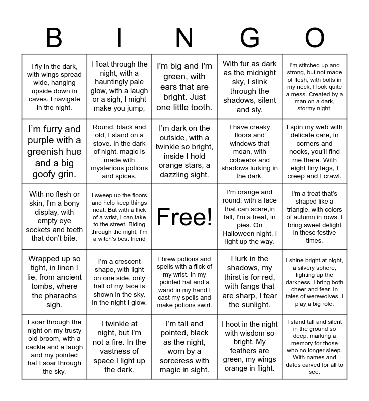 This bingo card has a free space and 27 words: I lurk in the shadows, my thirst is for red, with fangs that are sharp, I fear the sunlight., I'm orange and slimy, with eyes on a string. My big toothy smile makes you laugh and sing., I have creaky floors and windows that moan, with cobwebs and shadows lurking in the dark., I’m tall and pointed, black as the night, worn by a sorceress with magic in sight., I’m furry and purple with a greenish hue and a big goofy grin., I'm big and I'm green, with ears that are bright. Just one little tooth., I float through the night, with a hauntingly pale glow, with a laugh or a sigh, I might make you jump,, Wrapped up so tight, in linen I lie, from ancient tombs, where the pharaohs sigh., I'm orange and round, with a face that can scare,in fall, I'm a treat, in pies. On Halloween night, I light up the way., I shine bright at night, a silvery sphere, lighting up the darkness, I bring both cheer and fear. In tales of werewolves, I play a big role., With no flesh or skin, I'm a bony display, with empty eye sockets and teeth that don’t bite., With fur as dark as the midnight sky, I slink through the shadows, silent and sly., I soar through the night on my trusty old broom, with a cackle and a laugh and my pointed hat I soar through the sky., I twinkle at night, but I'm not a fire. In the vastness of space I light up the dark., I spin my web with delicate care, in corners and nooks, you’ll find me there. With eight tiny legs, I creep and I crawl., I glide through the night with a cloak of deep hue. My feathers are black, but my wings shine in green too., Round, black and old, I stand on a stove. In the dark of night, magic is made with mysterious potions and spices., I’m dark on the outside, with a twinkle so bright, inside I hold orange stars, a dazzling sight., I’m a crescent shape, with light on one side, only half of my face is shown in the sky. In the night I glow., I fly in the dark, with wings spread wide, hanging upside down in caves. I navigate in the night., I'm a treat that’s shaped like a triangle, with colors of autumn in rows. I bring sweet delight in these festive times., I hoot in the night with wisdom so bright. My feathers are green, my wings orange in flight., I sweep up the floors and help keep things neat. But with a flick of a wrist, I can take to the street. Riding through the night, I’m a witch’s best friend, I stand tall and silent in the ground so deep, marking a memory for those who no longer sleep. With names and dates carved for all to see., I brew potions and spells with a flick of my wrist. In my pointed hat and a wand in my hand I cast my spells and make potions swirl., I’m stitched up and strong, but not made of flesh, with bolts in my neck, I look quite a mess. Created by a man on a dark, stormy night. and I'm spun with precision. In the morning I glisten with dew drops. I’m a trap in the quiet night?.